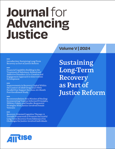 The Journal for Advancing Justice is a peer-reviewed scholarly journal for practical use. It provides justice and public health professionals, policymakers, academics, scholars, and researchers a forum to share evidence-based and promising practices on pressing issues facing the justice system today. The journal is supported by a grant from the White House Office of National Drug Control Policy. Note: Publication of an article in the Journal for Advancing Justice does not imply All Rise’s endorsement of any specific intervention, assessment, or other practice.